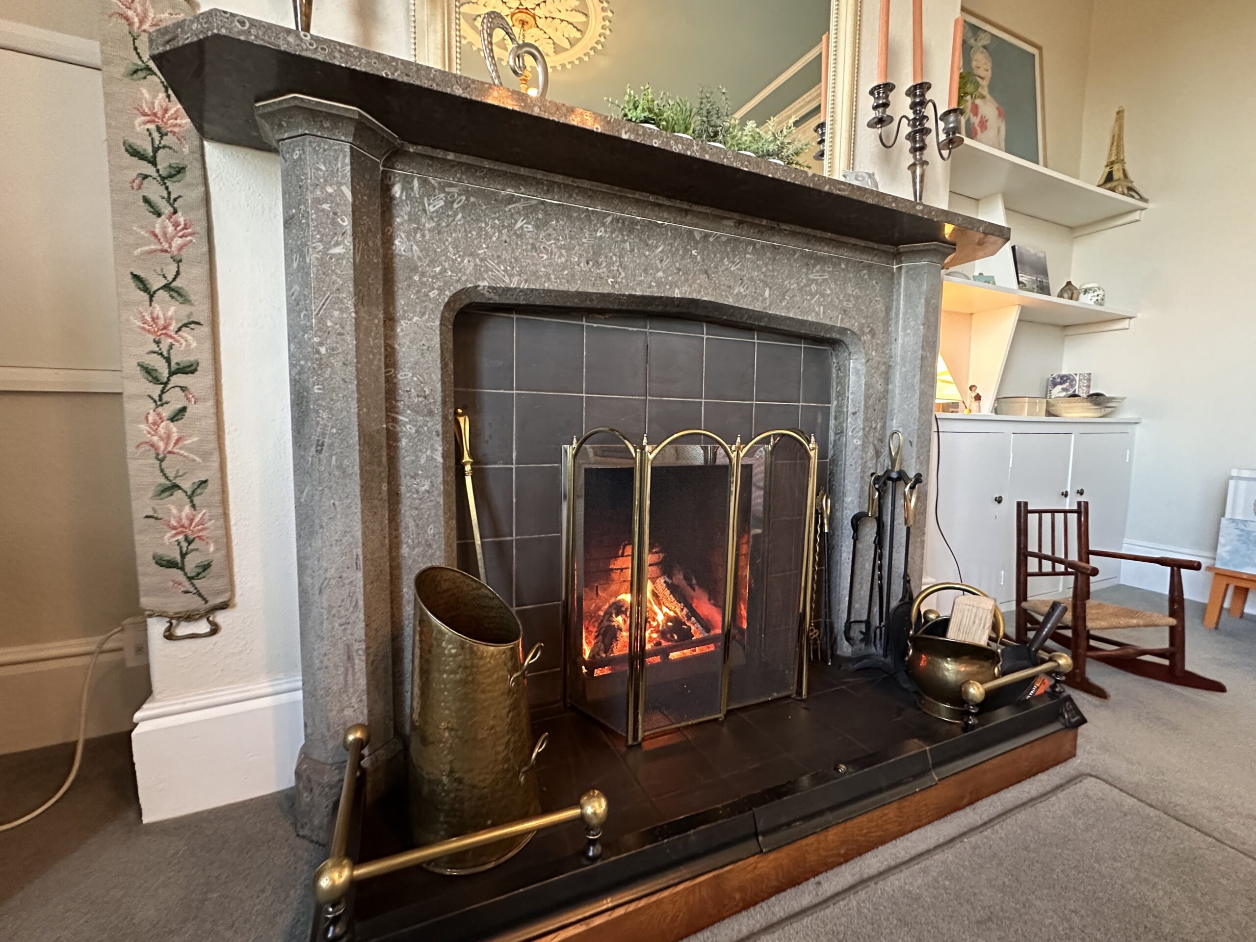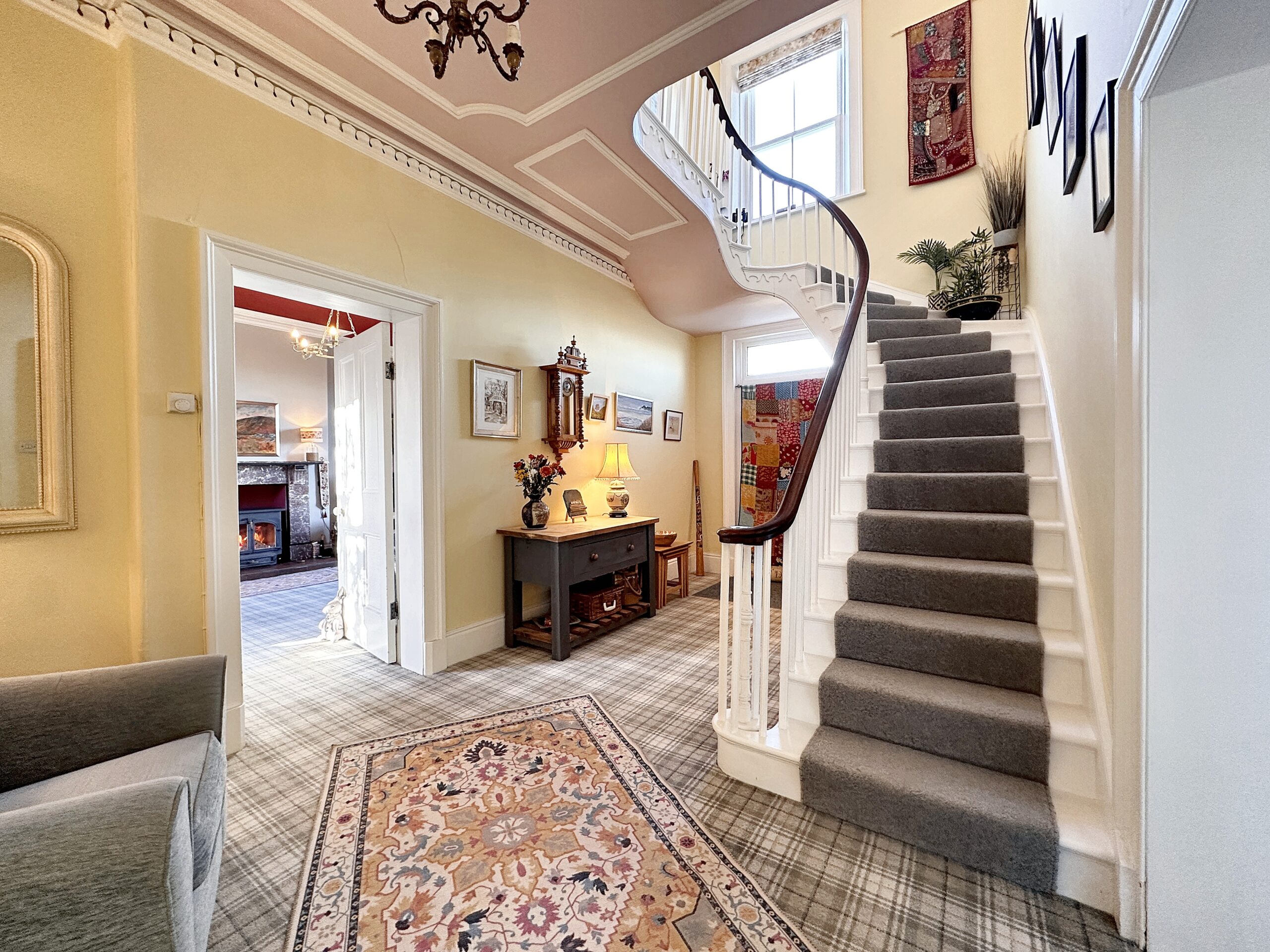 The grand entrance hall, complete with a sweeping staircase, creates an unforgettable first impression. From here, two generous reception rooms flow beautifully. The Living Room enjoys dual-aspect views over the Solway and the rear garden, centred around a Clearview 650 multi-fuel stove set on a Belgian flame marble hearth. The Sitting Room offers an equally inviting atmosphere, featuring an open fire and an attractive period fireplace, perfect for cosy evenings.