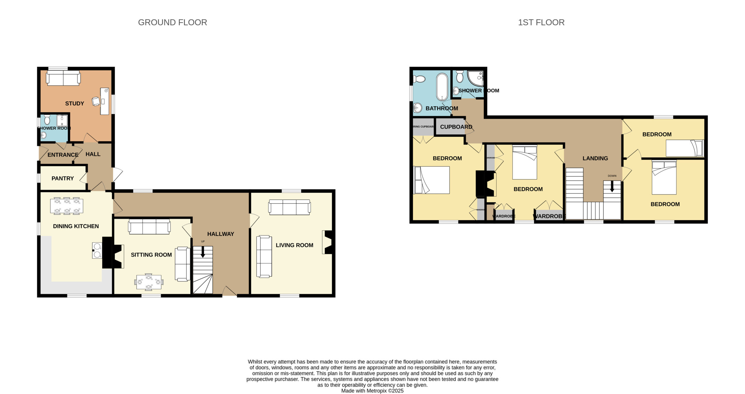 - Convenient ground-floor accommodation, including a shower room, WC, and a Study with library shelving.
