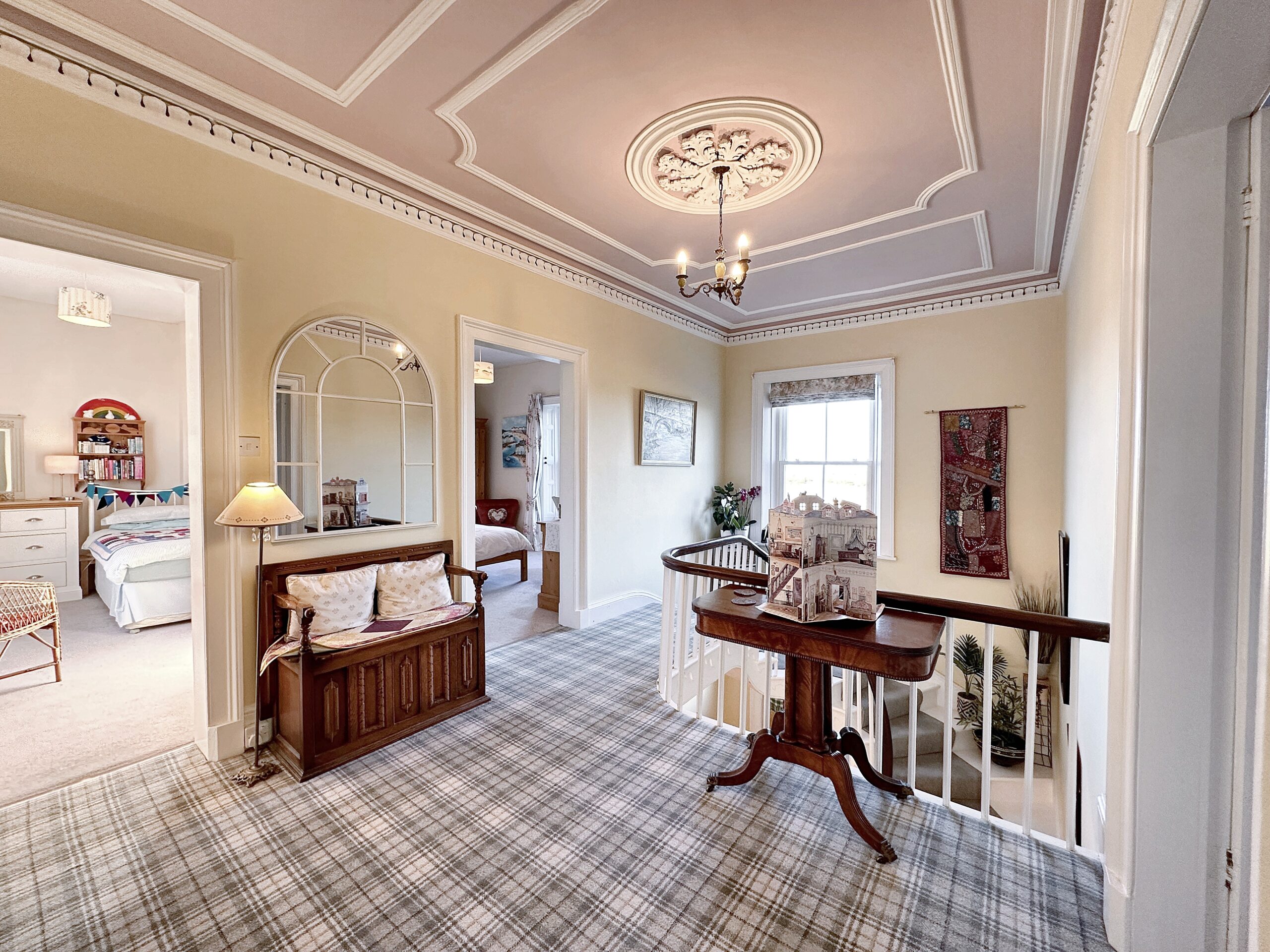 Ascending to the first floor, the spectacular landing immediately commands attention, with its beautiful decorative plaster to the ceiling and far-reaching views over the Solway. This level offers three large double bedrooms and a well-proportioned single bedroom, all filled with natural light. A shower room and a separate bathroom serve the accommodation, ensuring comfort and flexibility for family living or visiting guests.