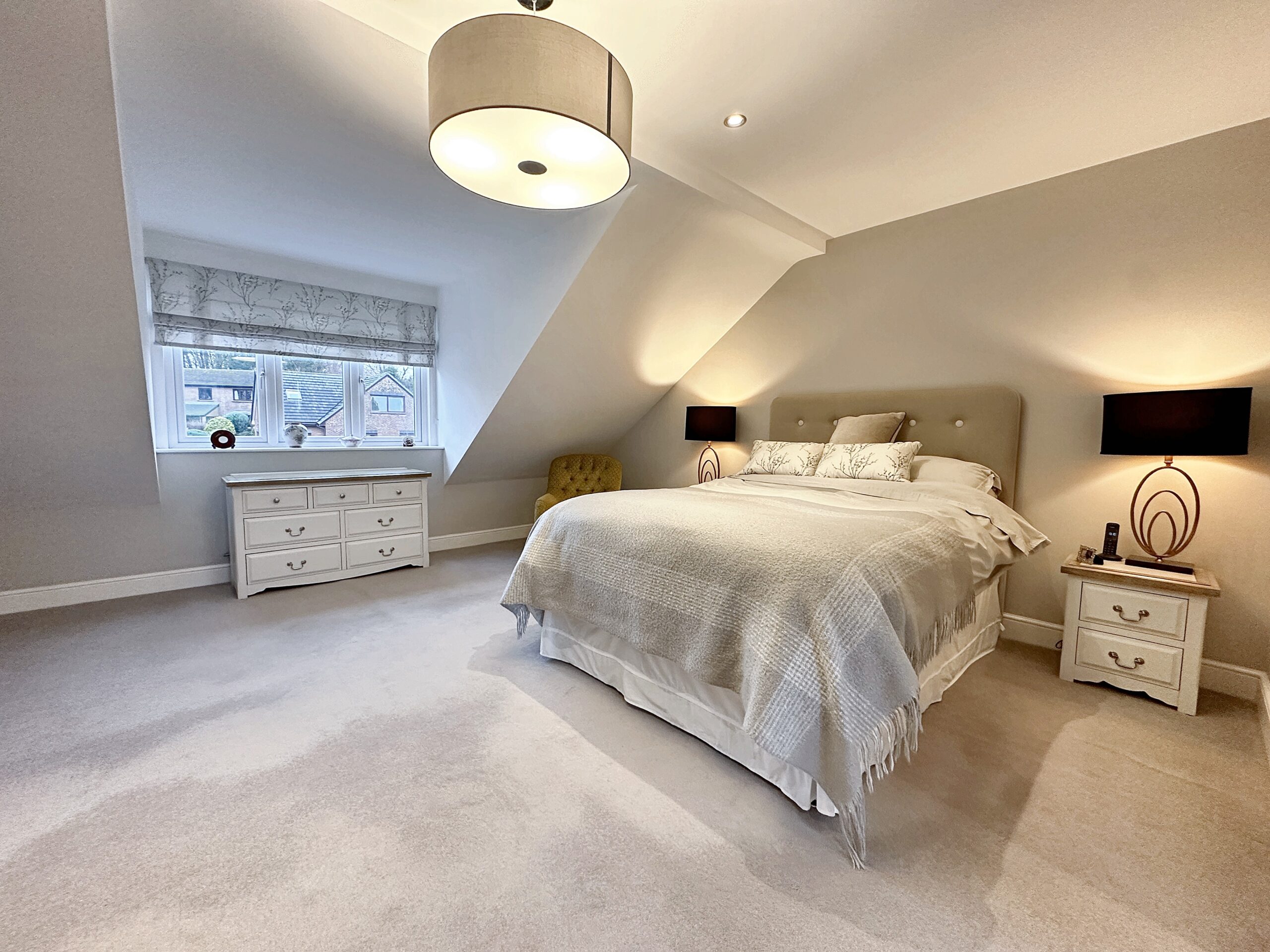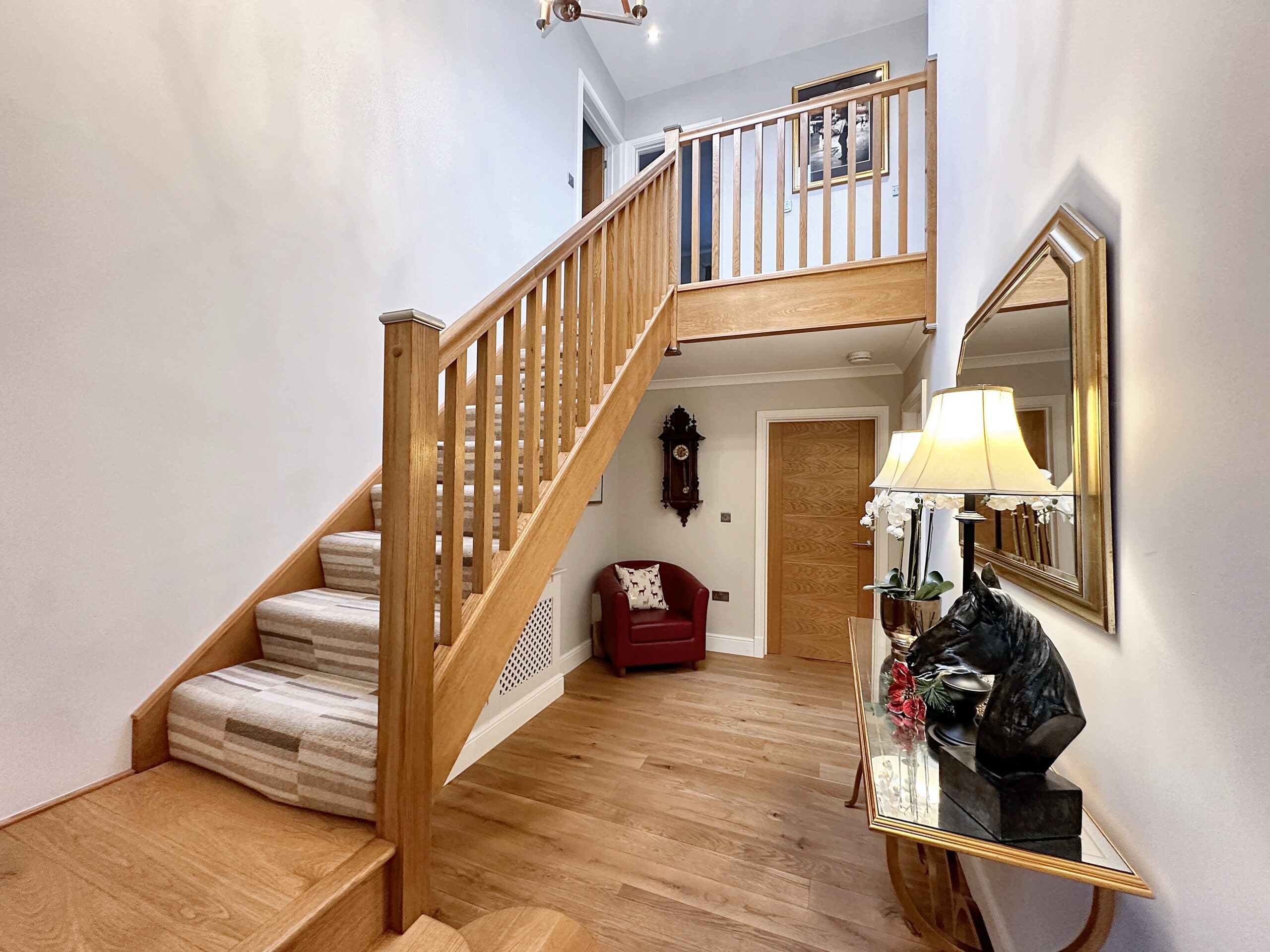 The first floor is equally impressive, accessed via the oak staircase to a spacious gallery landing, which enhances the sense of space and light. The principal bedroom suite extends the full width of the property and offers a luxurious retreat, complemented by a stylish en-suite shower room finished with sleek contemporary fittings. There are three further well-proportioned double bedrooms, ideal for family members or guests, along with a beautifully appointed four-piece family bathroom.