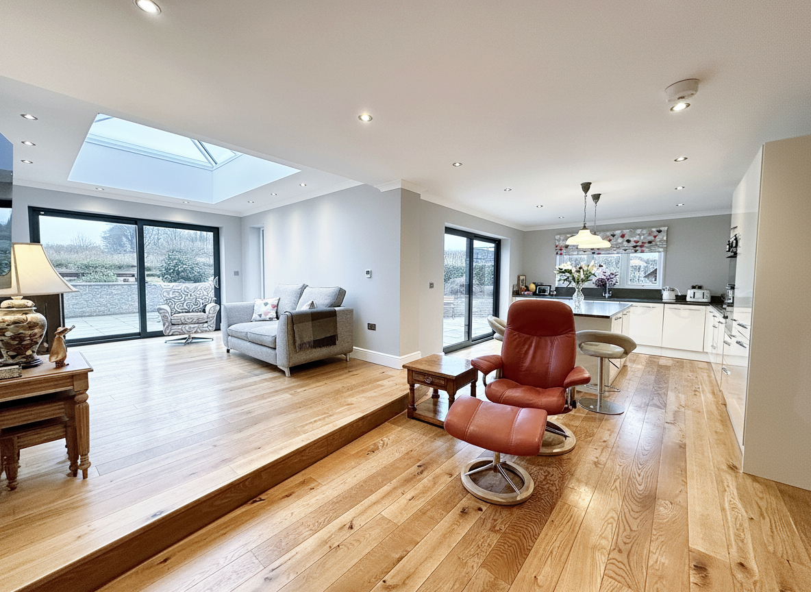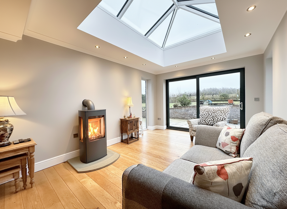 Open to the kitchen is the outstanding family room, where a stylish Dru Trio gas stove provides a striking focal point. A large roof lantern floods the room with natural light, creating a bright and airy atmosphere while framing views towards the garden and open countryside beyond.