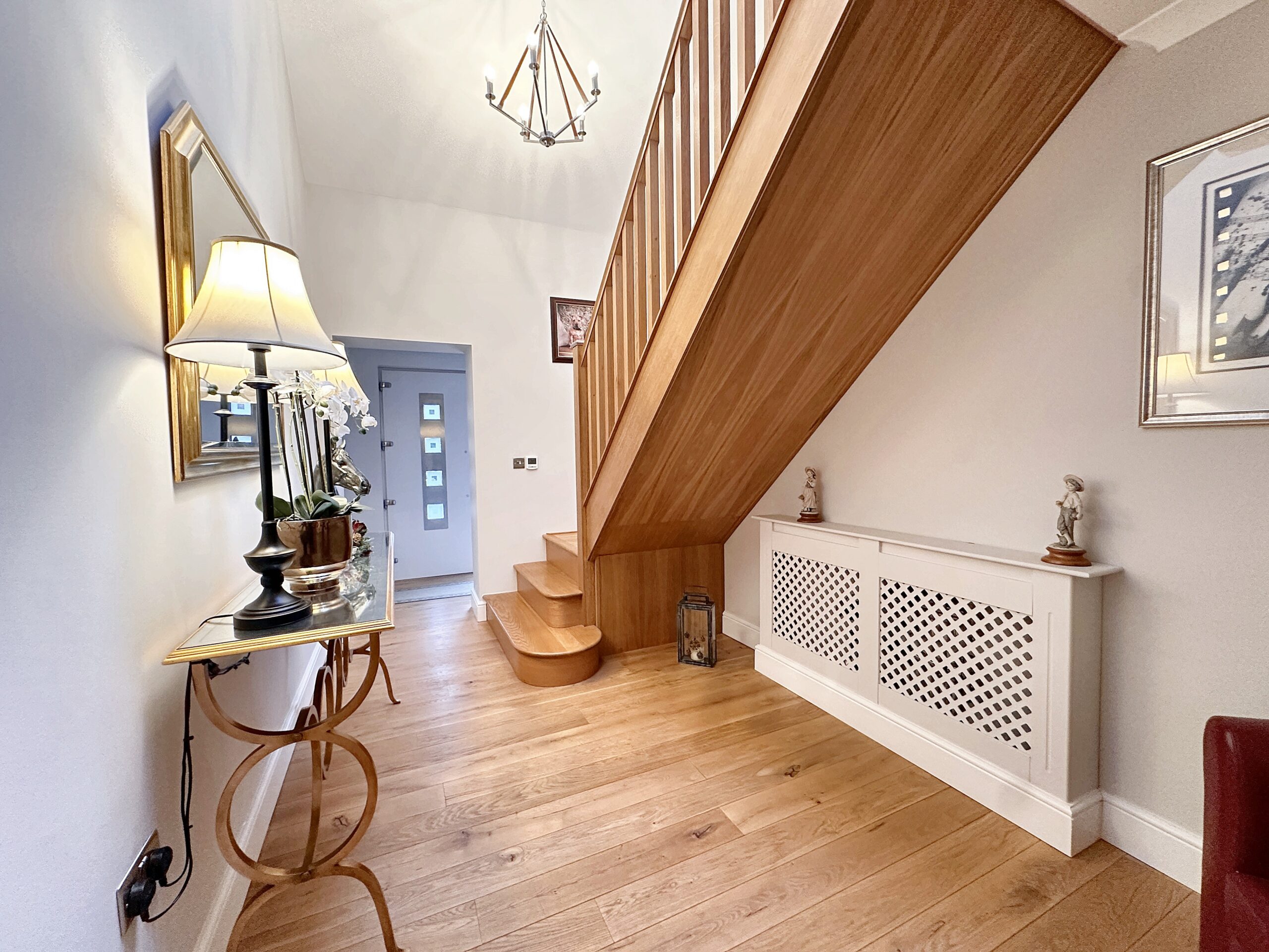 Enjoying a beautiful open rear aspect across adjoining fields, this thoughtfully designed home combines modern living with quality craftsmanship and energy efficiency throughout. Upon entering, you are greeted by a spacious and welcoming entrance hallway, where an attractive oak staircase creates a striking first impression and sets the tone for the accommodation beyond.