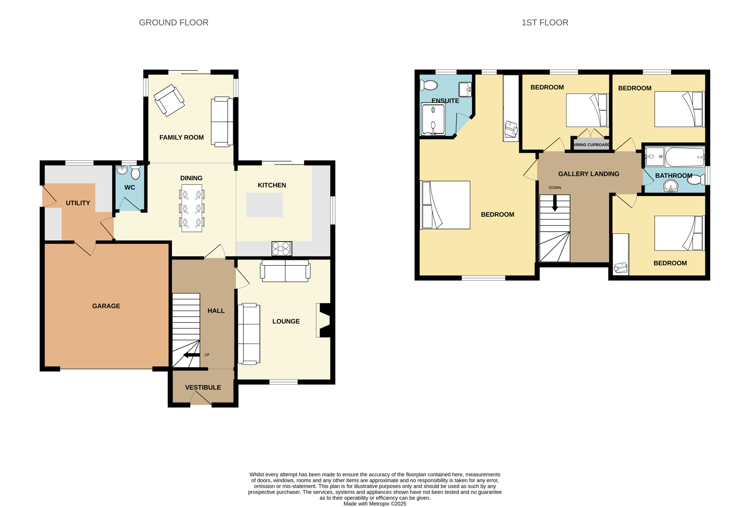 Practicality is well catered for with a generously sized utility room, offering ample work surfaces and storage, plumbing for a washing machine, venting for a tumble dryer and a stable door providing convenient external access. The integral garage is accessed directly from the utility room, adding further everyday convenience. Completing the ground floor is a modern WC.