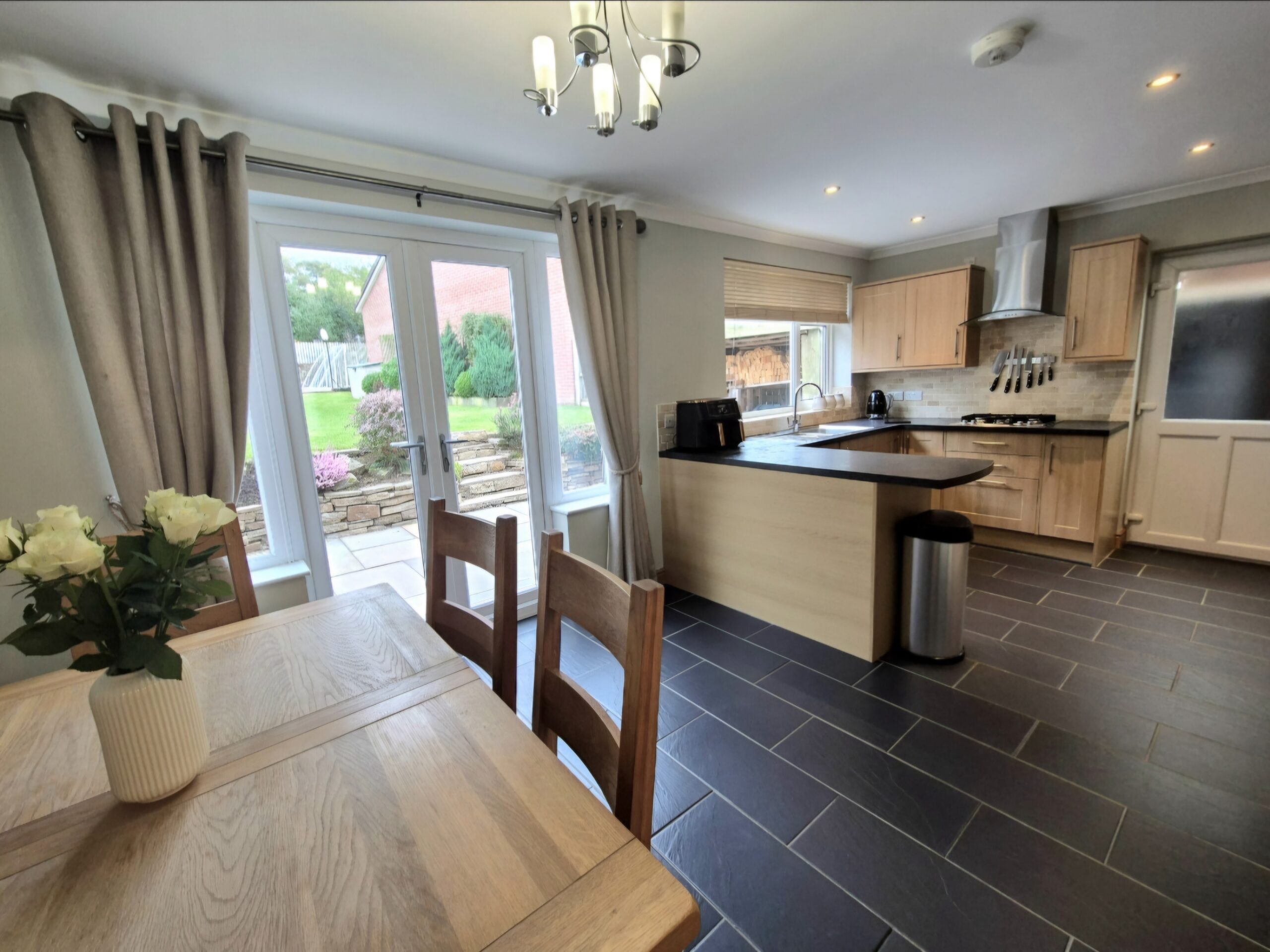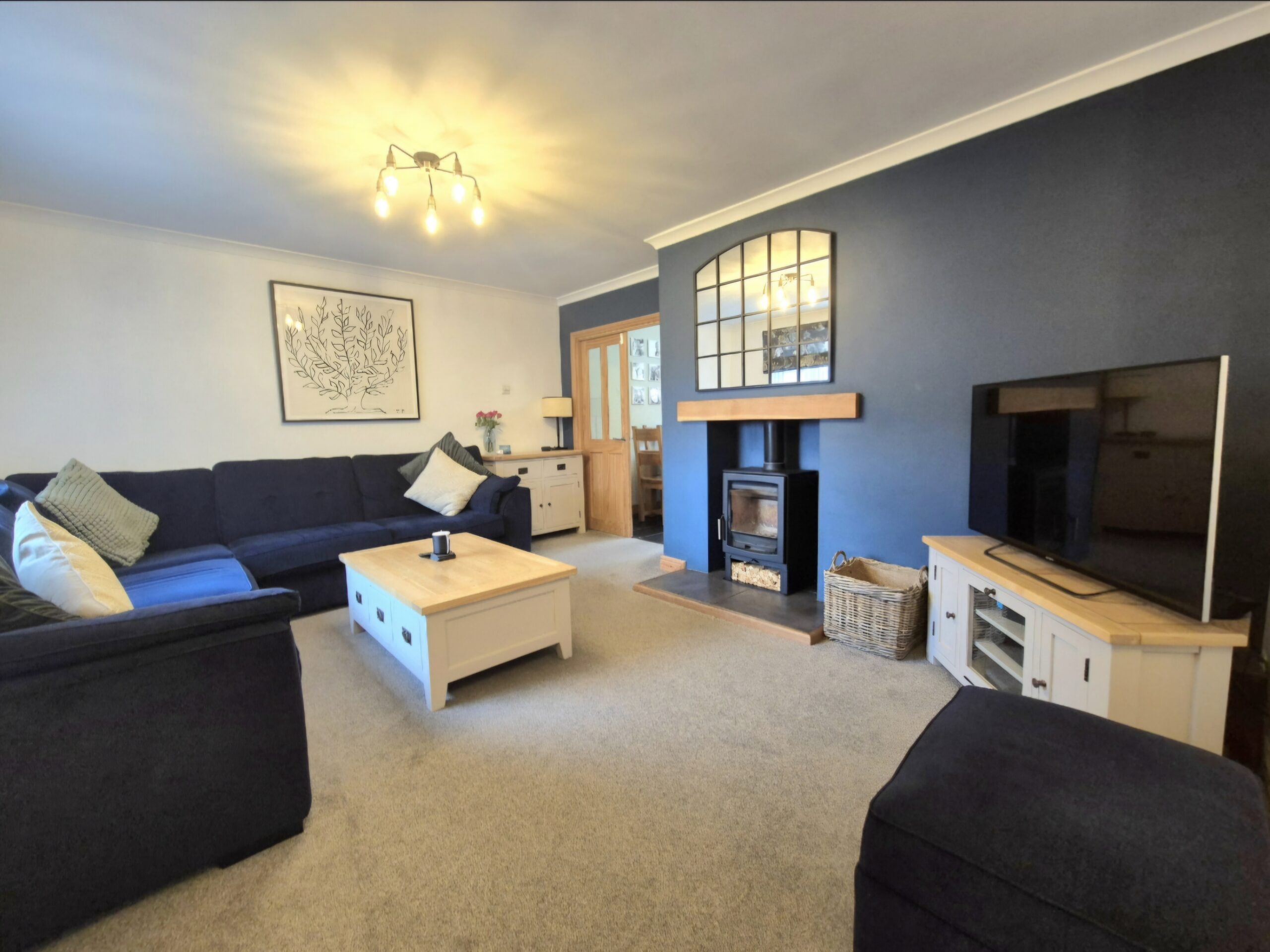 The accommodation is both stylish and spacious, starting with a welcoming entrance porch leading into a cosy yet well-proportioned lounge, complete with a characterful multi-fuel stove – perfect for relaxing evenings. To the rear, the modern open-plan dining kitchen is a true highlight, featuring French doors that open directly onto a generous, beautifully landscaped rear garden – ideal for entertaining or family life.