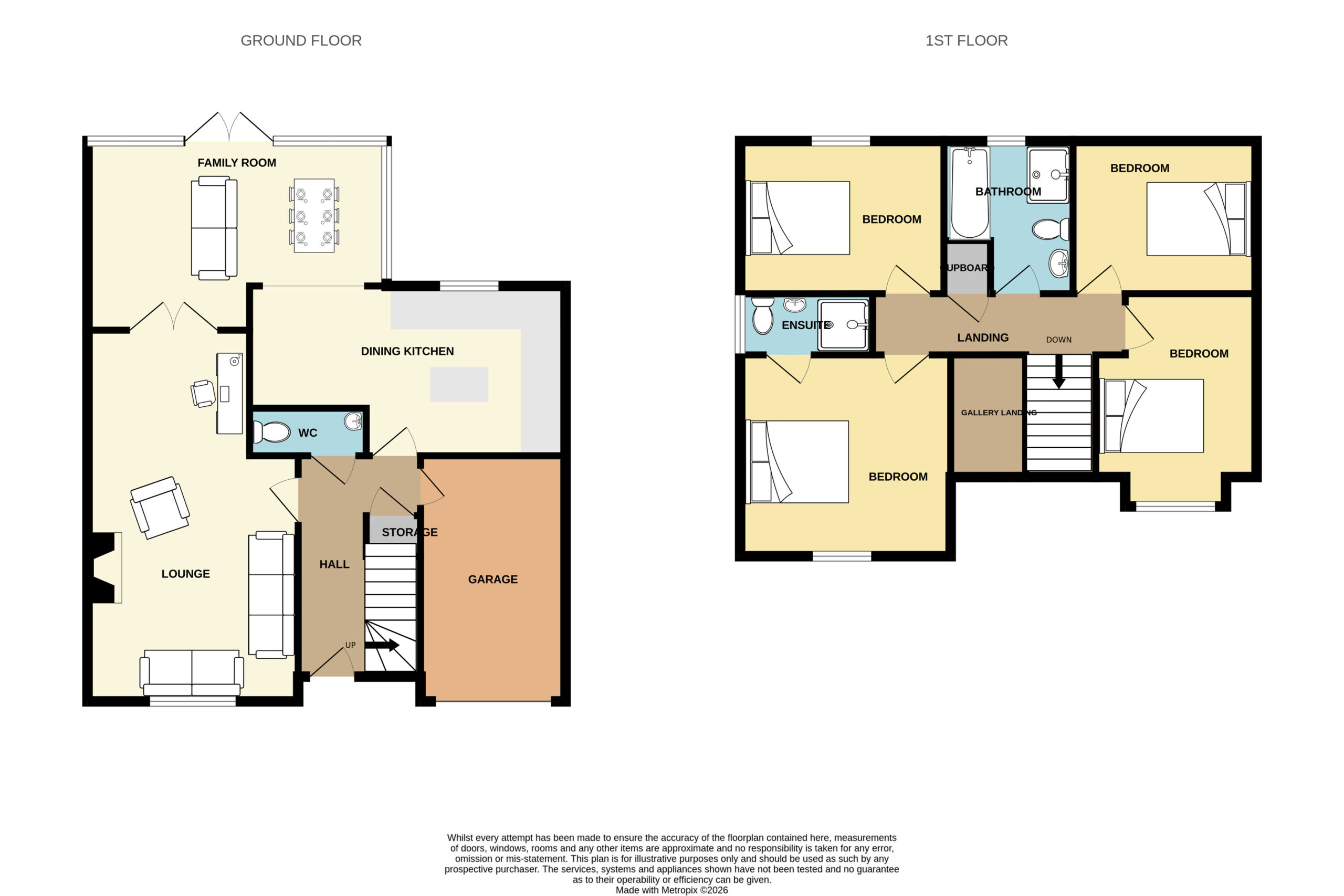 To the first floor are four spacious double bedrooms, including a principal bedroom with en-suite shower room, while the remaining bedrooms are served by a well-appointed four-piece family bathroom. The property further benefits from gas central heating and double glazing, ensuring comfort and efficiency year-round.