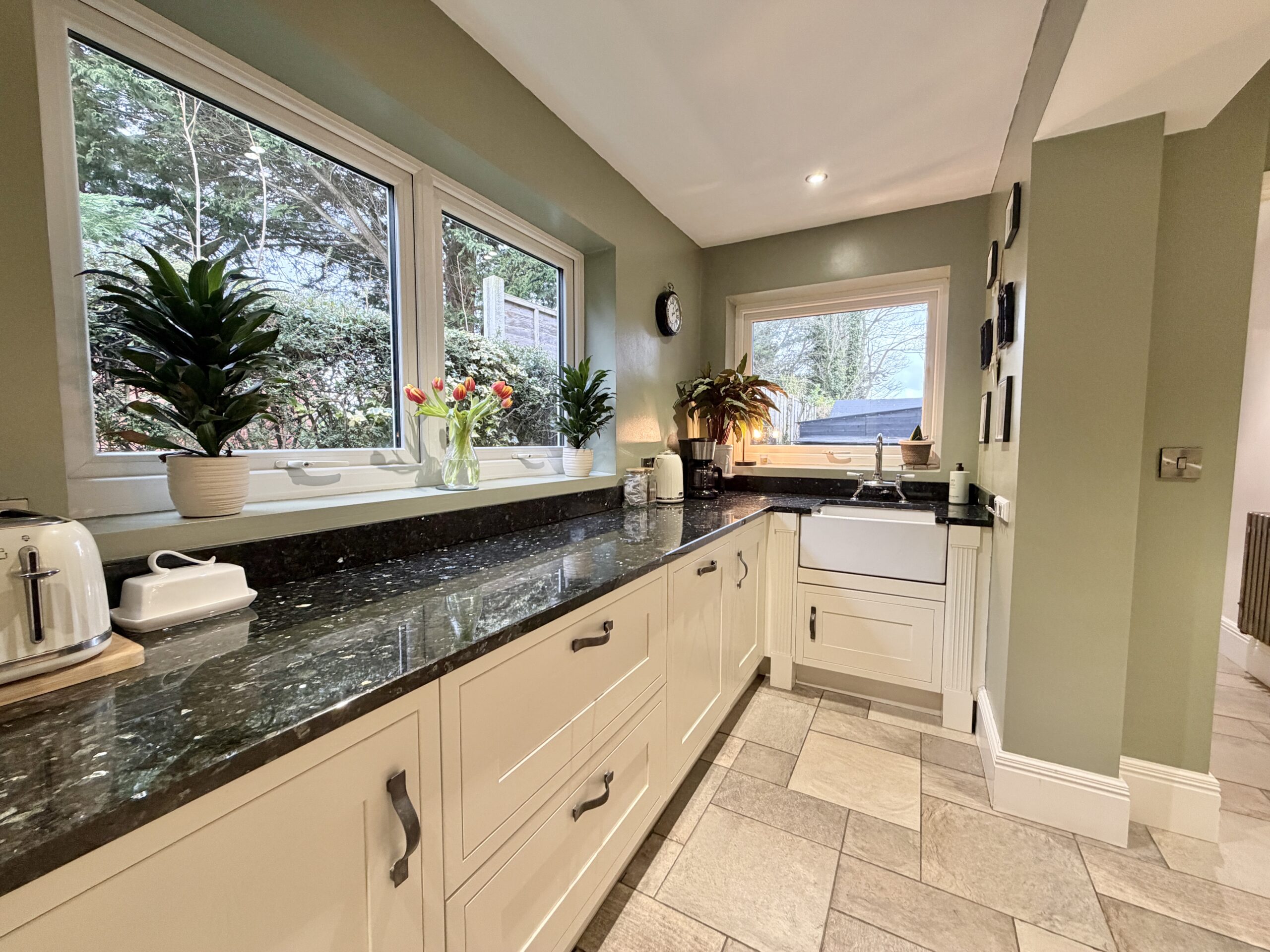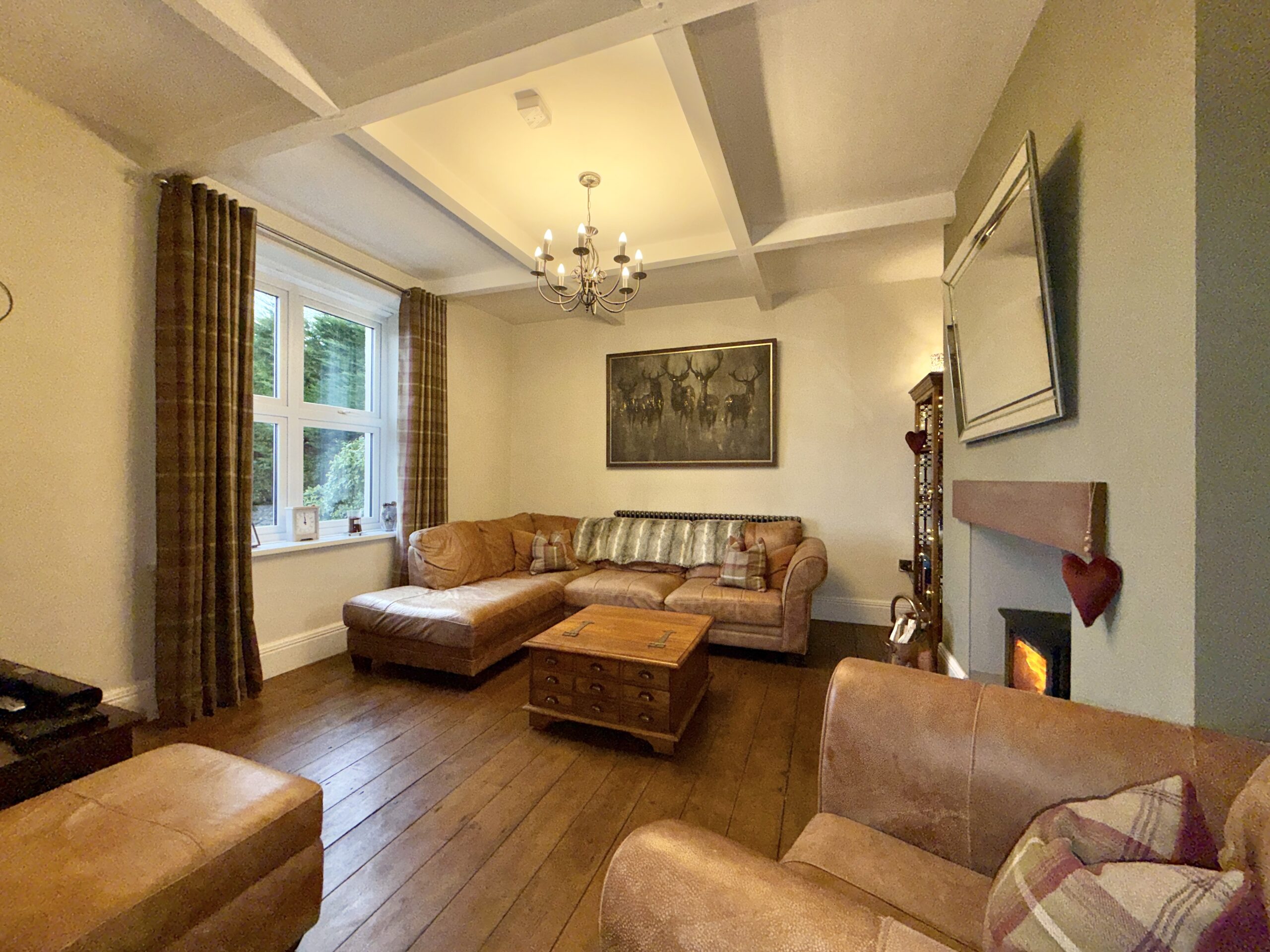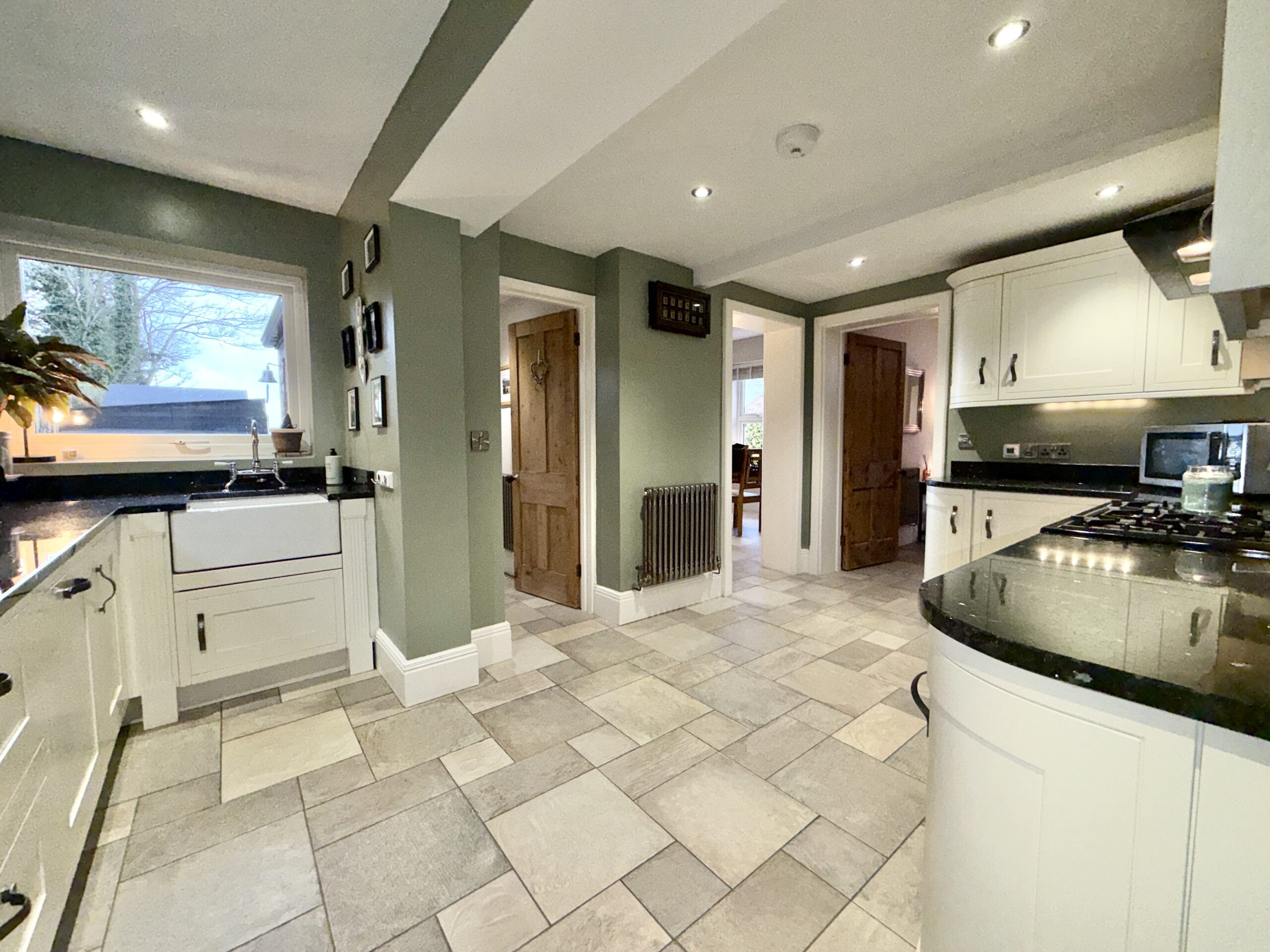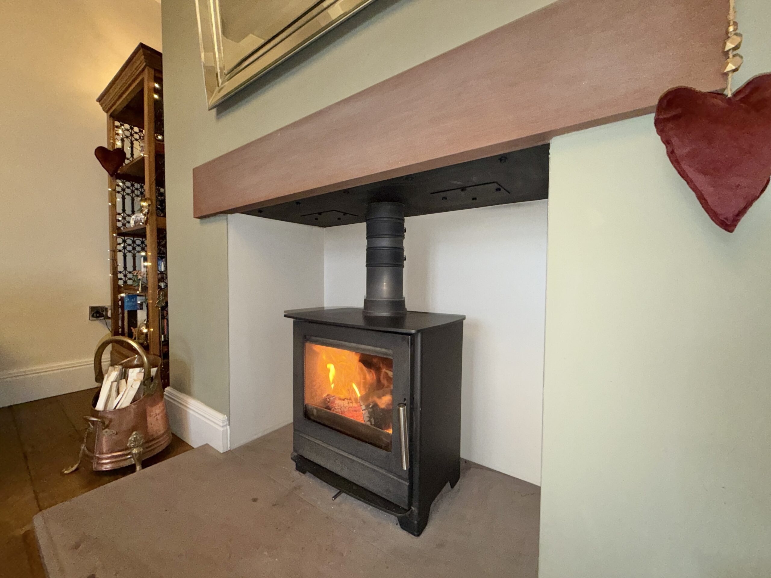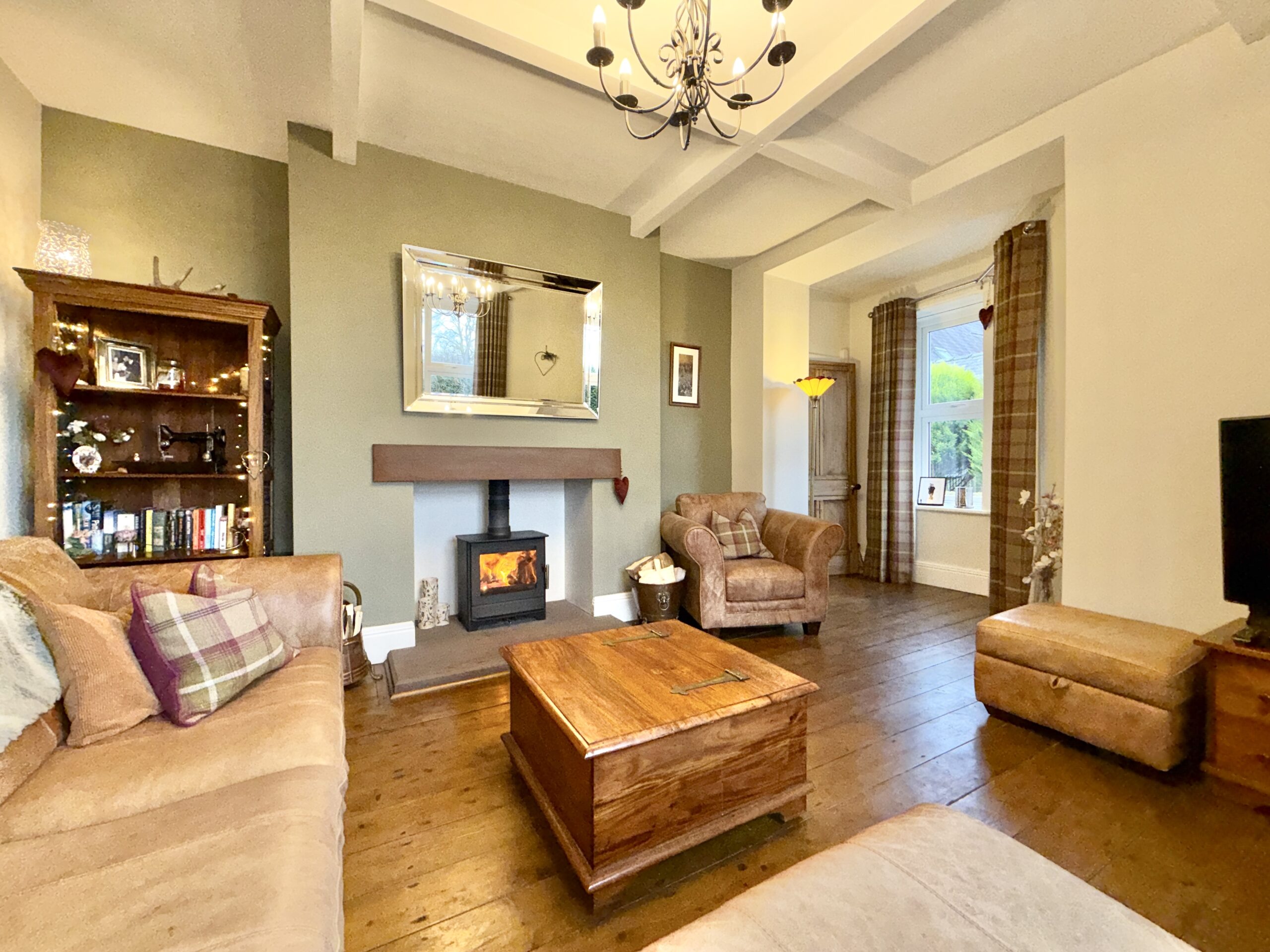 The front-facing lounge is warm and inviting, featuring a wood-burning stove and open views across surrounding fields — a perfect retreat on winter evenings. Off the hallway, the beautifully appointed kitchen is fitted with shaker-style cabinetry, Granite Worktops, a range-style oven, full height integrated fridge, dishwasher, Belfast sink, and tiled flooring, blending classic character with modern convenience. A separate utility with a full height freezer and a handy laundry area sits just off the kitchen, adding further practicality.