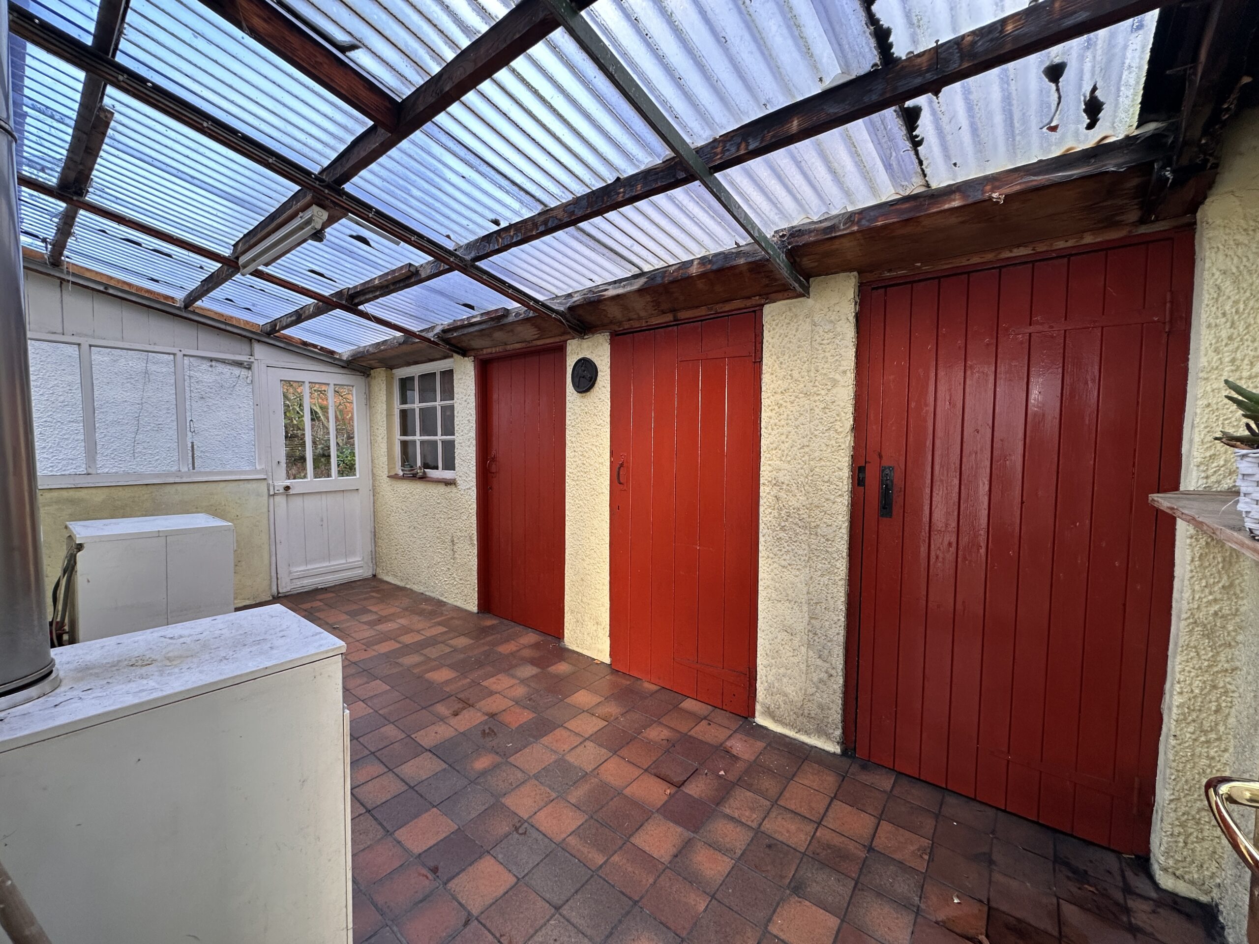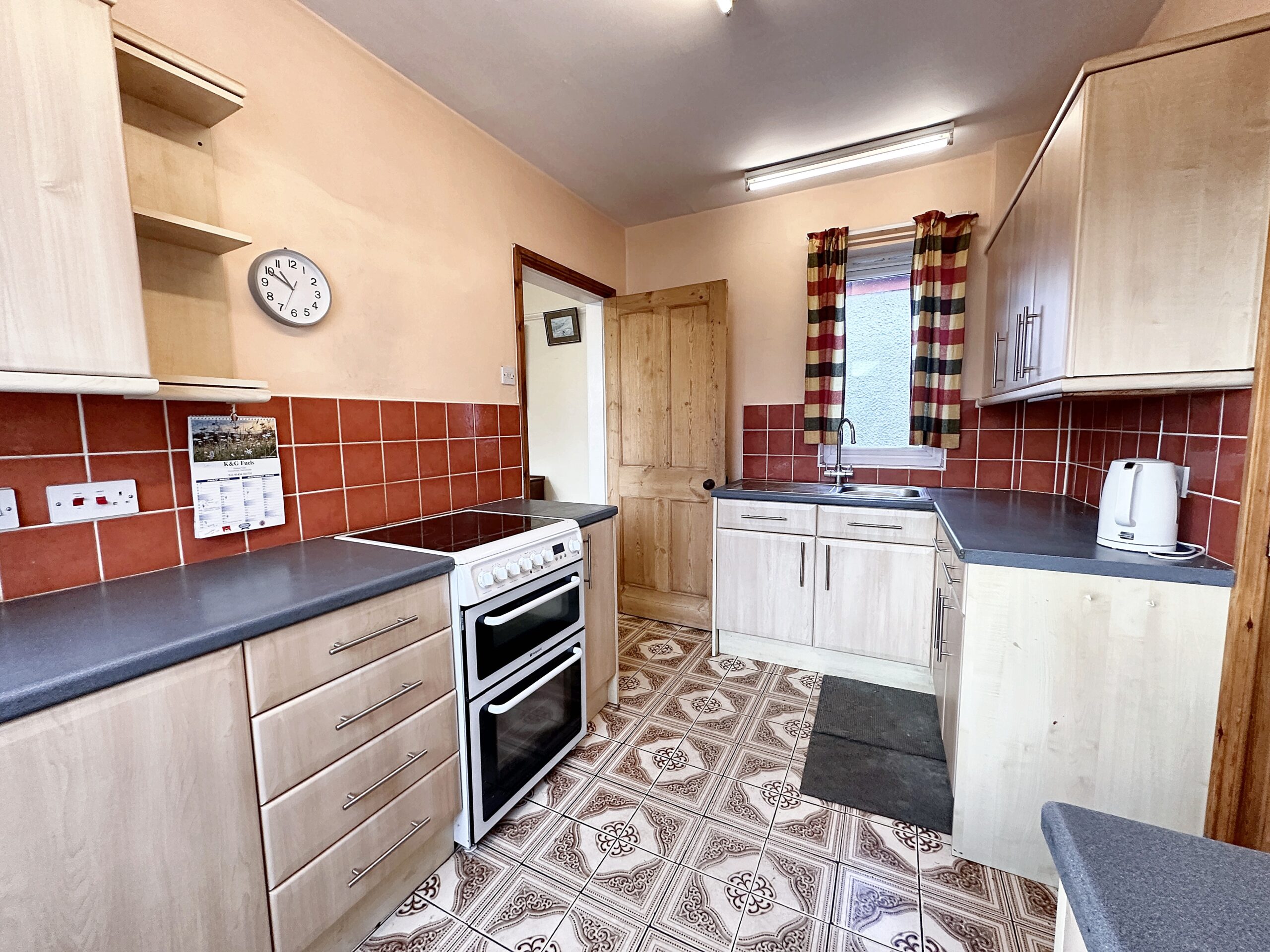 Inside, the accommodation is arranged over one level. The front-facing living room features an open fire, giving the space a warm and traditional feel. A separate dining room flows through to the kitchen, and to the rear there is a covered porch—an incredibly useful area that includes two large storage cupboards and a coal house.