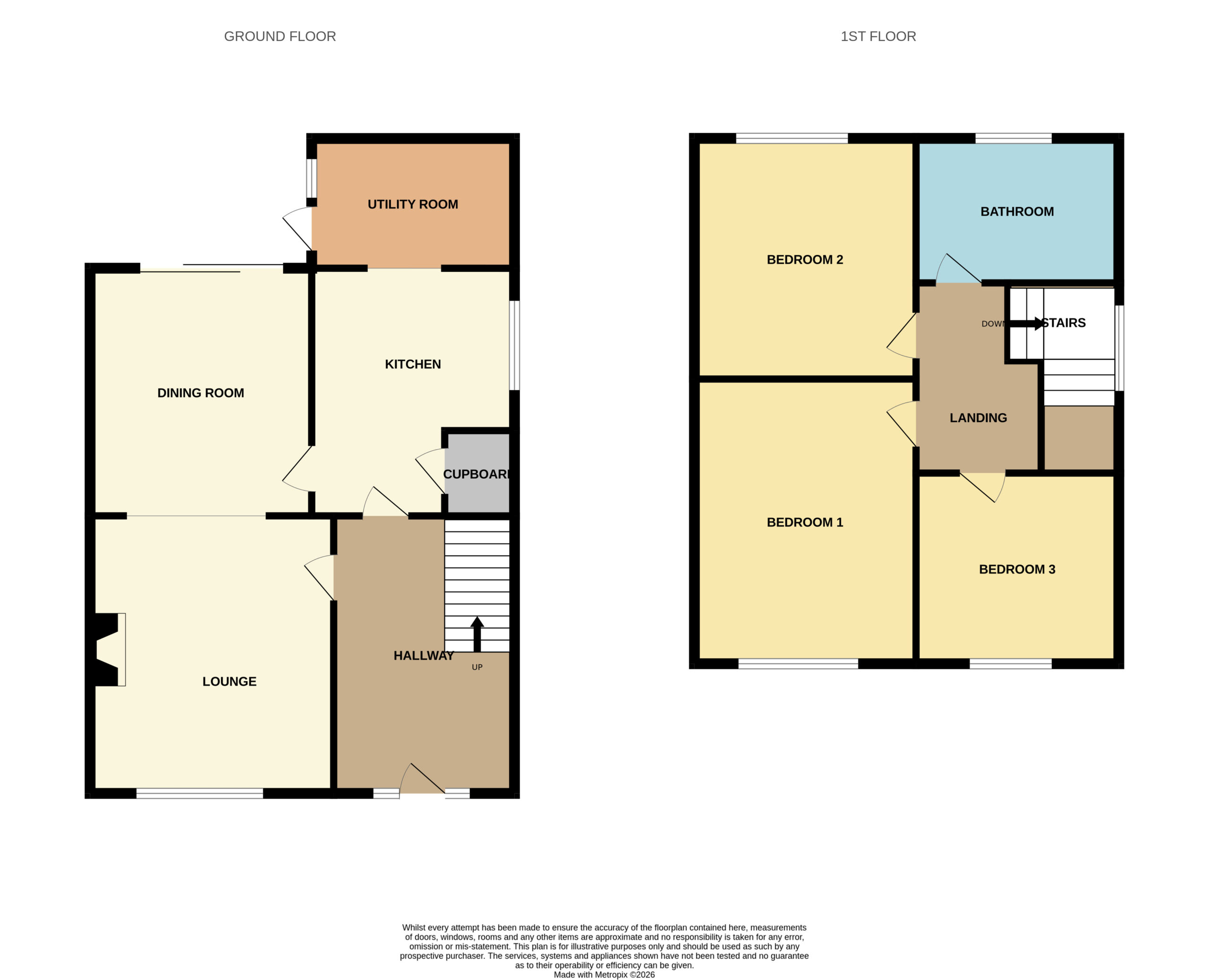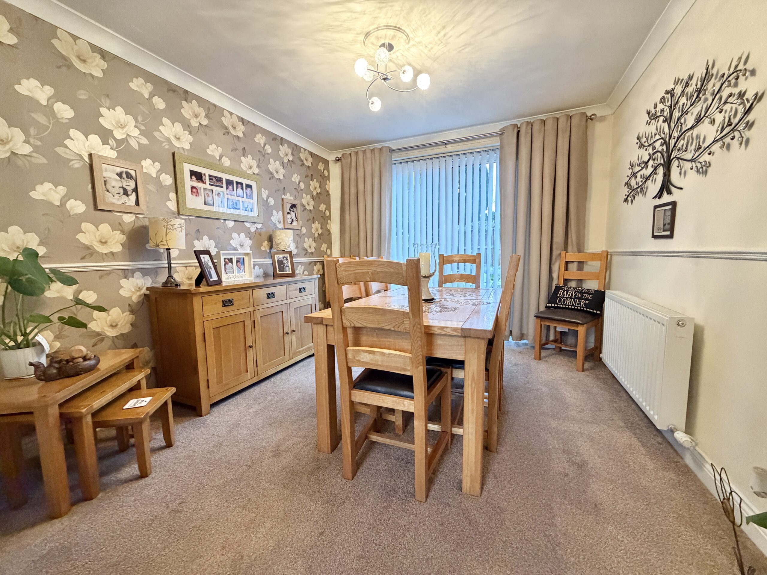 The accommodation begins with a welcoming entrance leading into a spacious lounge which flows seamlessly through to the dining area, creating an ideal space for both everyday living and entertaining. Patio doors from the dining room open directly onto the garden, allowing for plenty of natural light and an easy connection to outdoor living. The kitchen is well appointed and is complemented by a useful adjoining utility area.