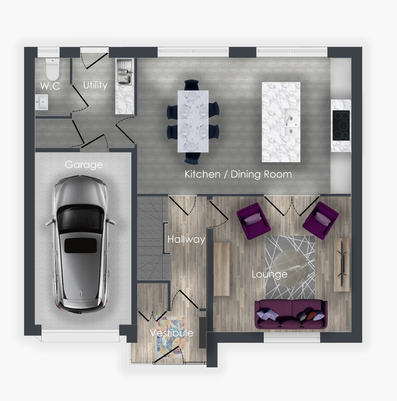 Flooded with natural light, the property offers a wonderful sense of space from the moment you enter. The striking vestibule with floor-to-ceiling windows and an apex ceiling leads through to the entrance hall, complete with an oak staircase rising to the first floor. The ground floor includes a stylish lounge, a spacious dining kitchen with double bi-folding doors opening onto the rear garden & central island , a practical utility room, cloakroom and access to the integral garage.