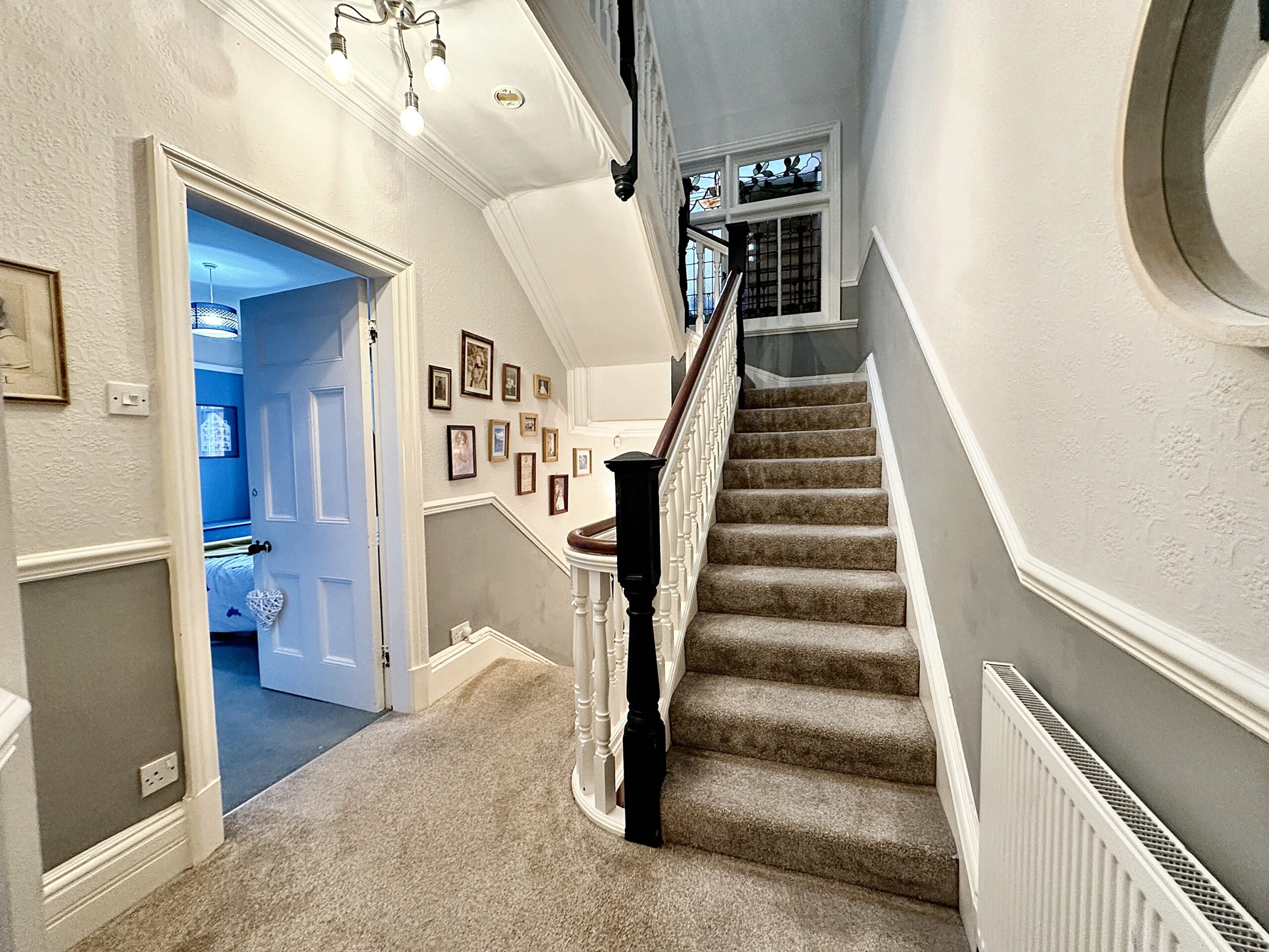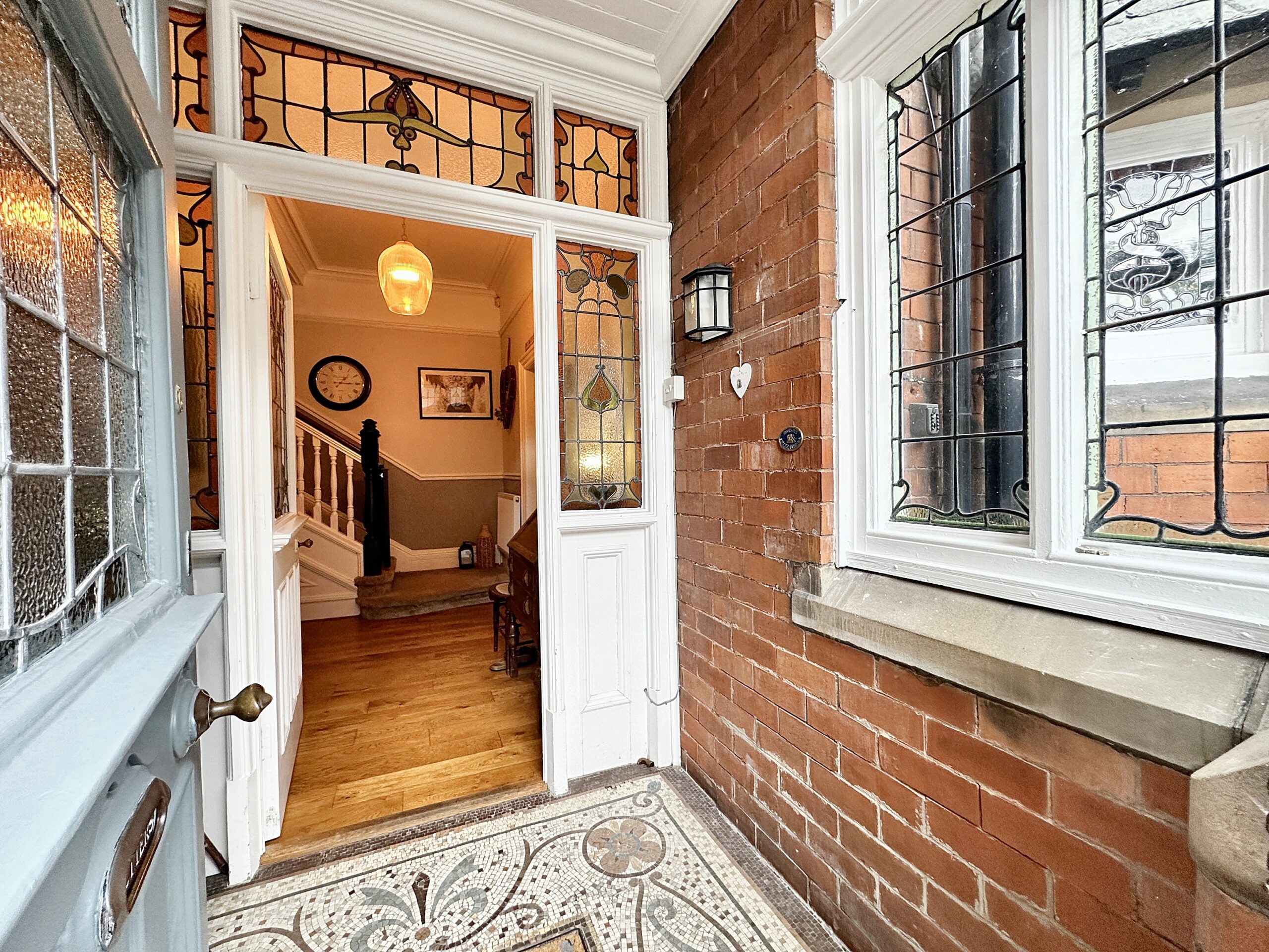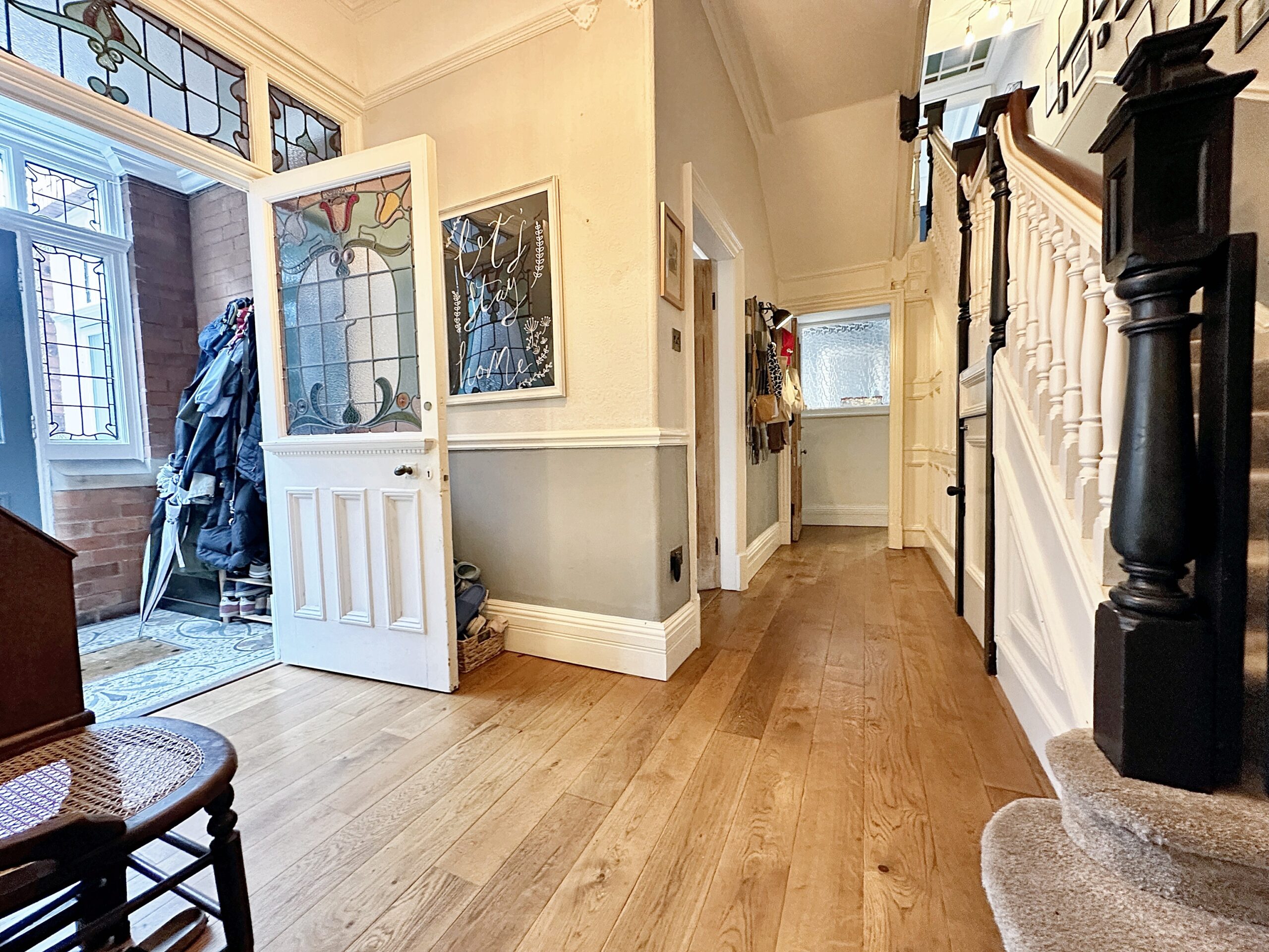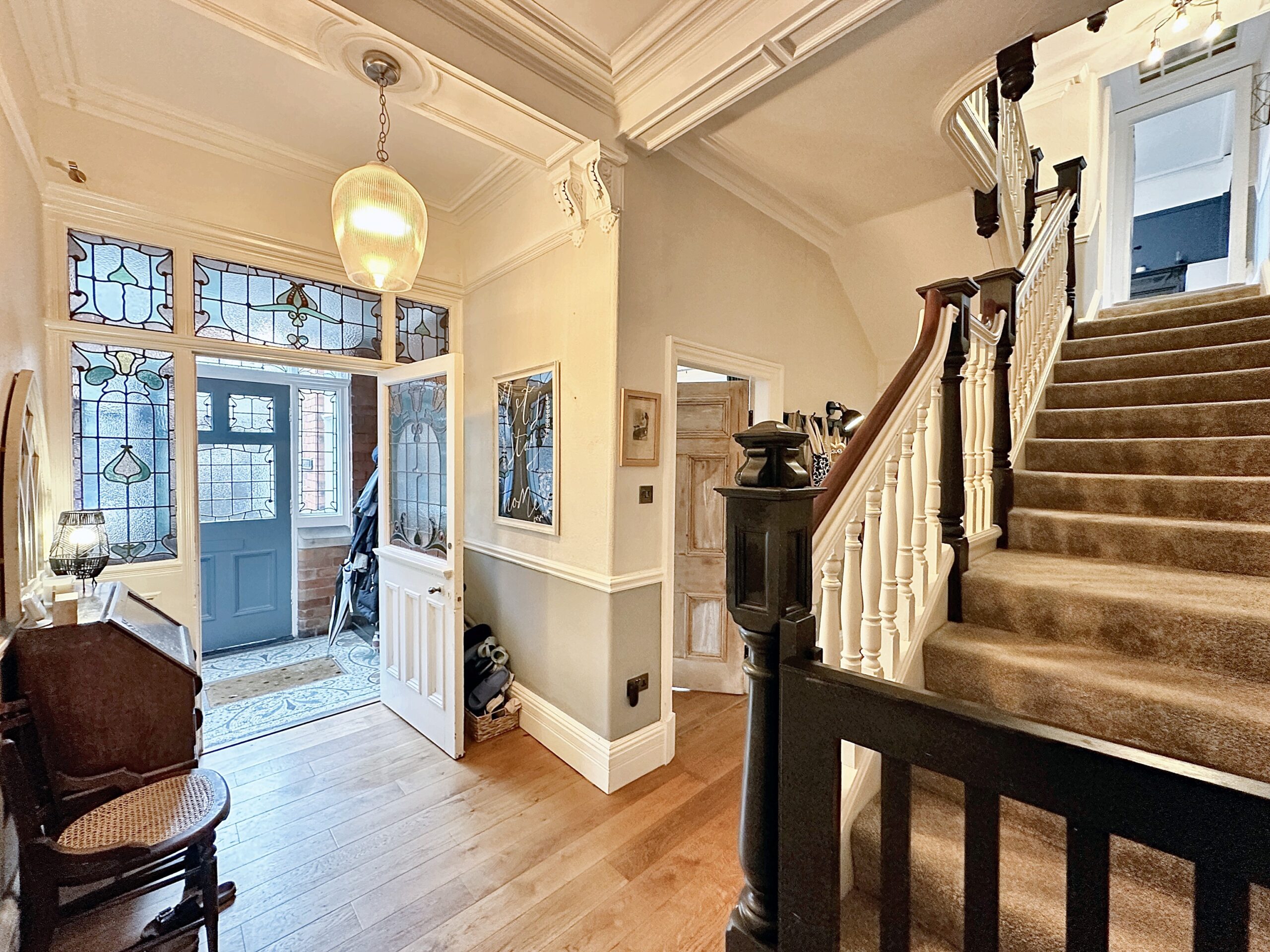 From the moment you arrive, the home’s kerb appeal is undeniable, with a charming front garden, traditional façade, and a spacious driveway providing ample off-road parking along with access to the garage. Step through the entrance vestibule into a grand and welcoming hallway, where stained glass details, and elegant proportions immediately capture your attention.