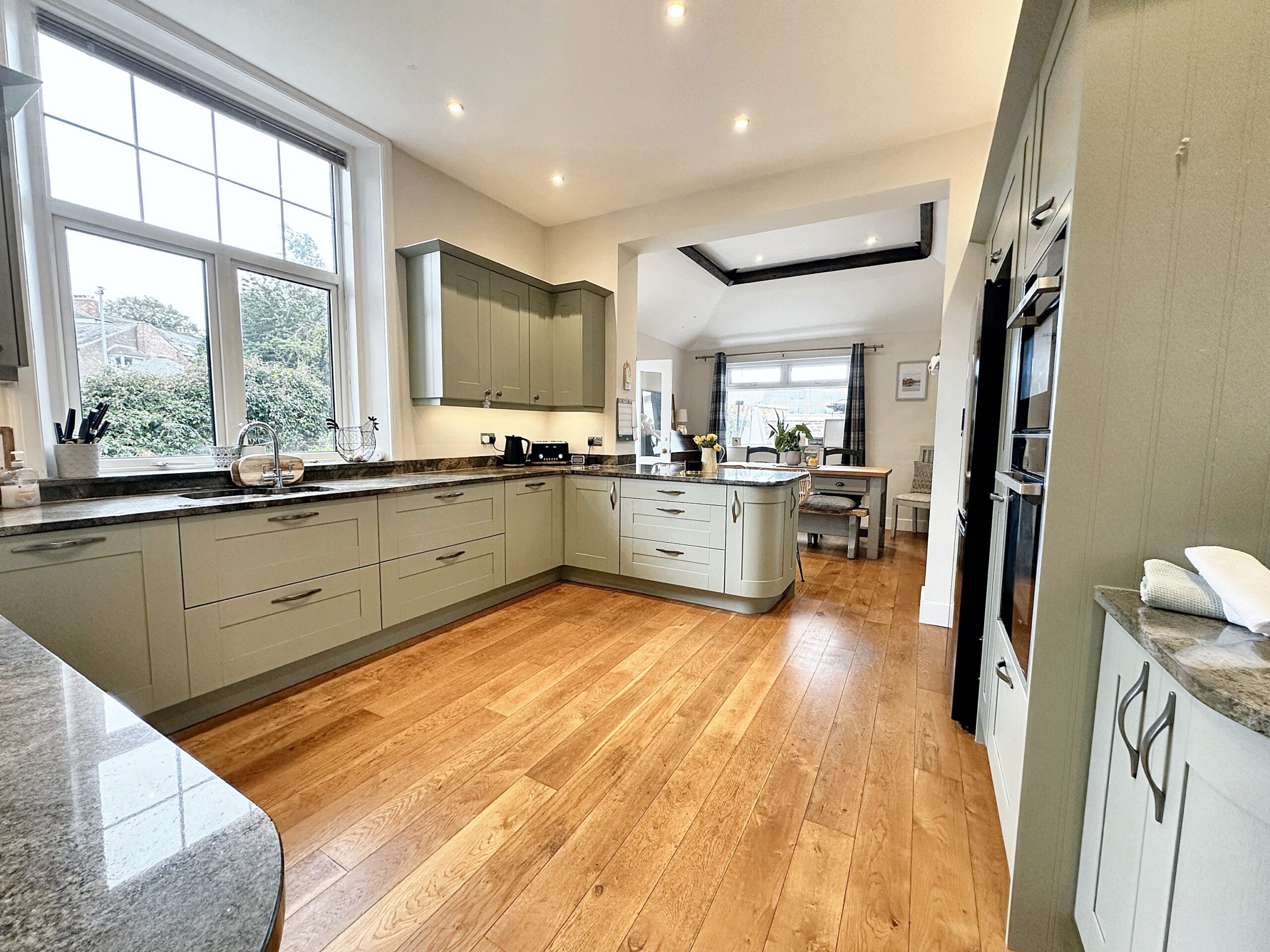 - Bespoke fitted kitchen with high-quality integral appliances, open to a family dining area and flowing into a bright conservatory with views over the garden