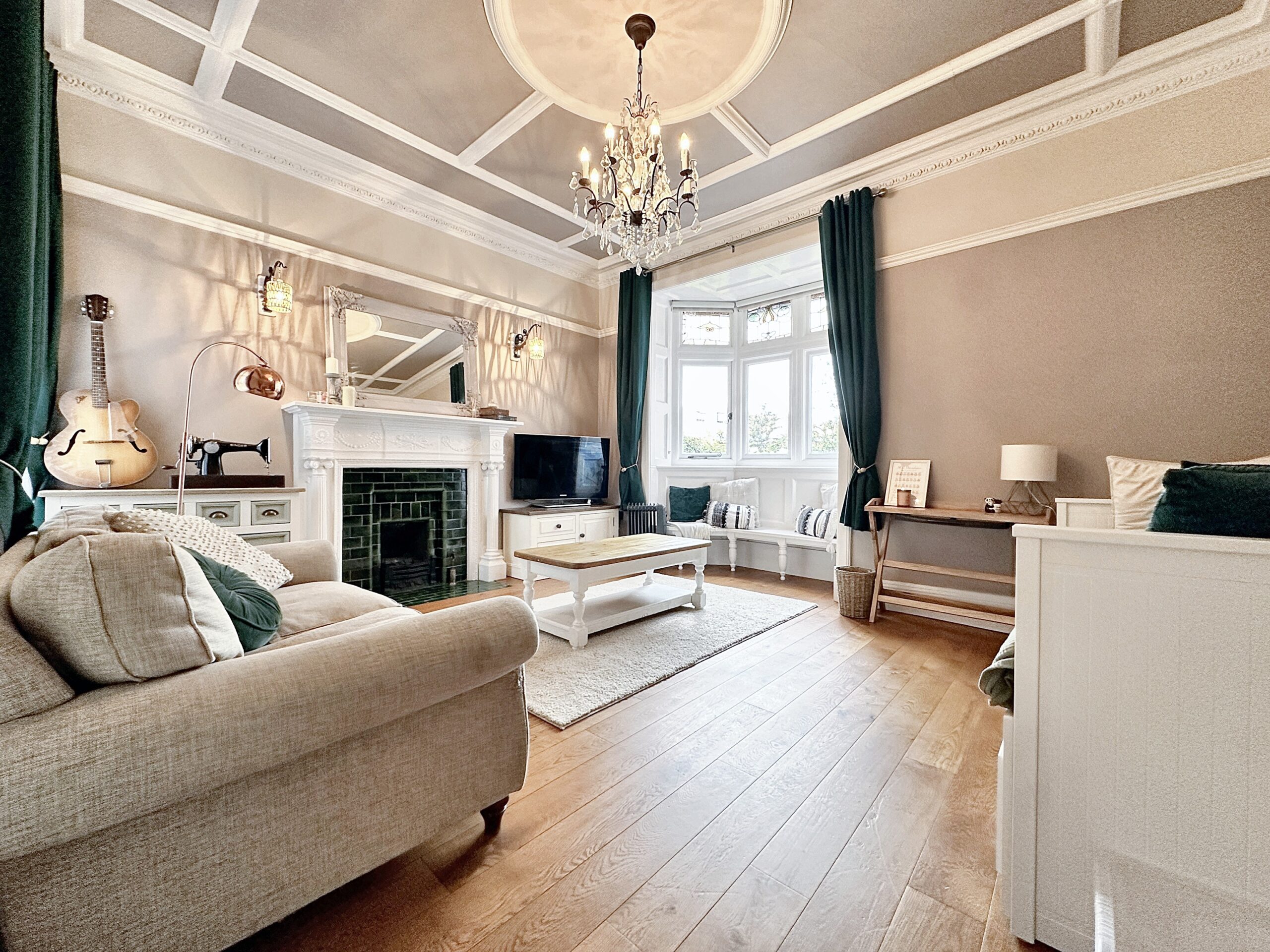 Two stunning reception rooms – the lounge and sitting room – flow from the hallway, each boasting exquisite period fireplaces, ceiling panelling and large windows that flood the rooms with natural light. These spaces are perfect for both formal entertaining and relaxed family living.