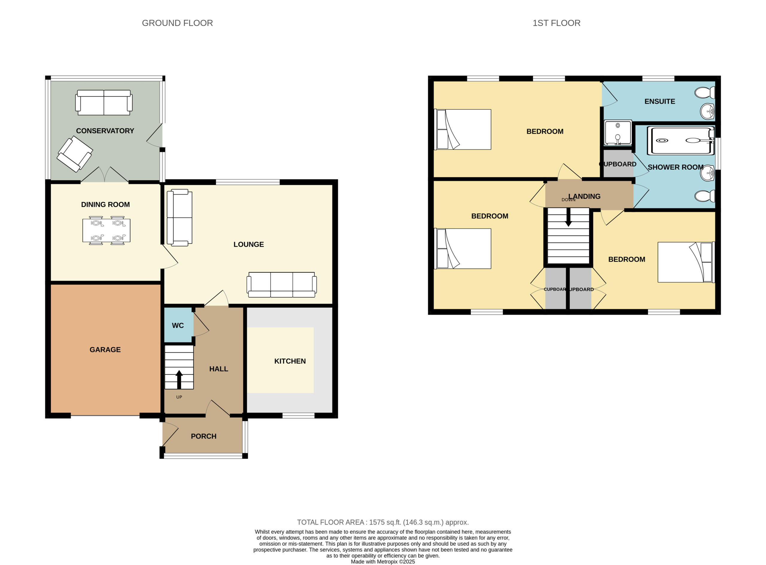 Upstairs, the home features three generous double bedrooms, all well-proportioned and filled with natural light. The principal bedroom benefits from its own en-suite shower room, while a modern family shower room serves the remaining bedrooms.
